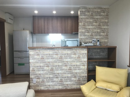 豊田市/LDKリフォーム/間取り変更/キッチンリフォーム/レンガ調のアクセントクロスがとても素敵な印象です**