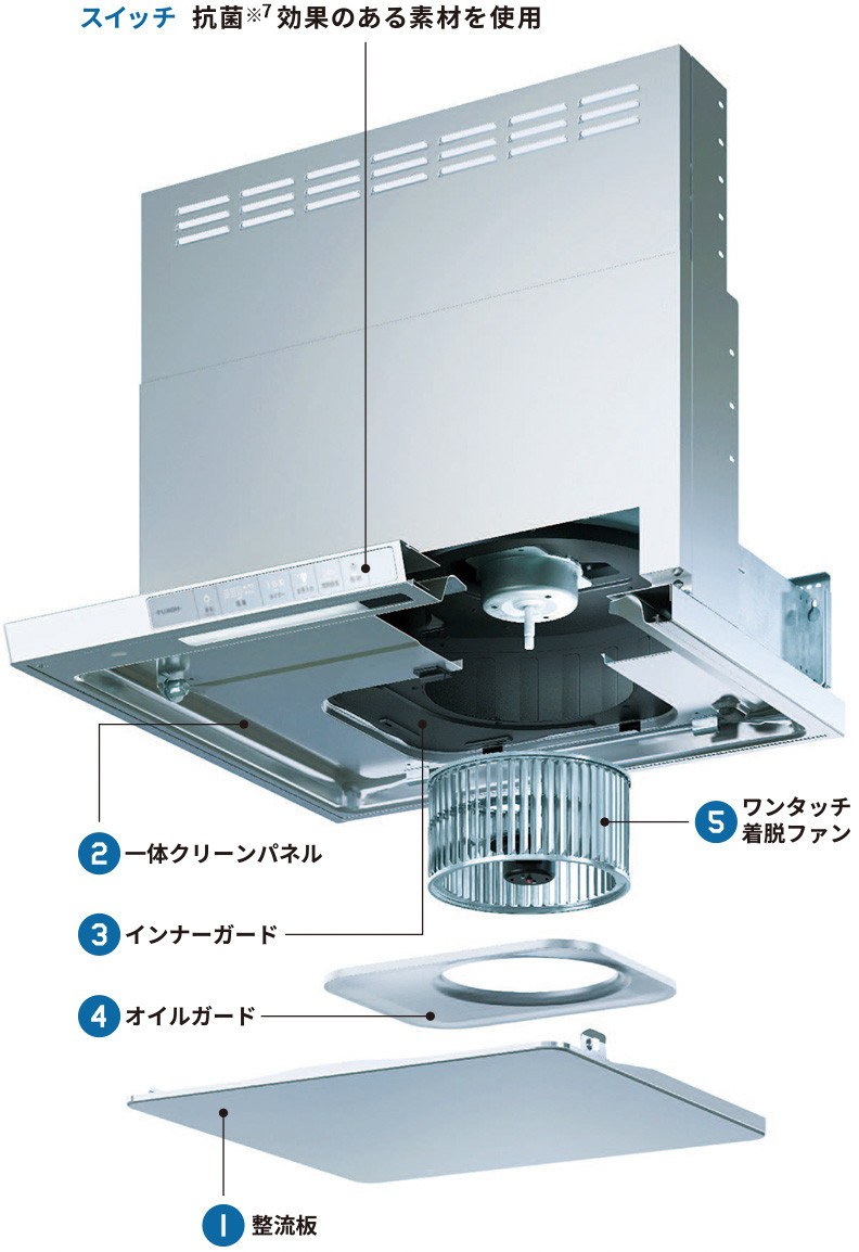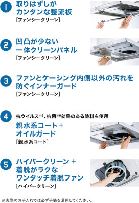 水で油を浮かす親水系コートが施されており、サッと水洗いするだけで簡単にお手入れができます。またお手入れパーツは整流版とオイルガードと脱着ファン3つのみ!