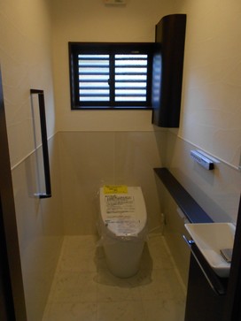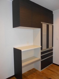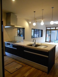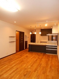 | 使用材料 | キッチン:クリナップ クリンレディ フラット対面 幅255センチ カップボード:クリナップ クリンレディ UB:TOTO サザナ 1616 洗面台:TOTO オクターブ 幅135センチ トイレ:TOTO ネオレストAH1 LDK、洋室床材:ナラ(無垢) 玄関引き戸:トステム K6シリーズ木屋町31型 |