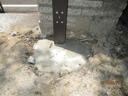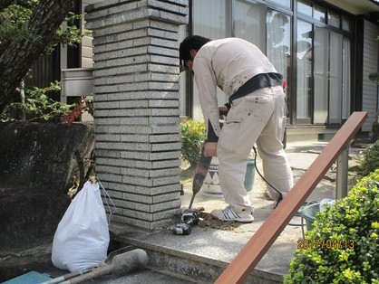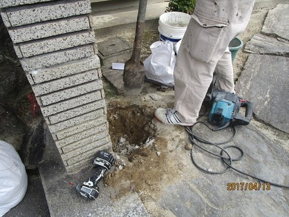 約30㎝ほど柱は埋まっています。柱の周りのモルタルと土を取り除きます!