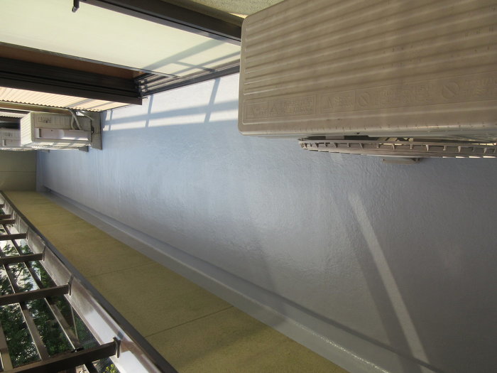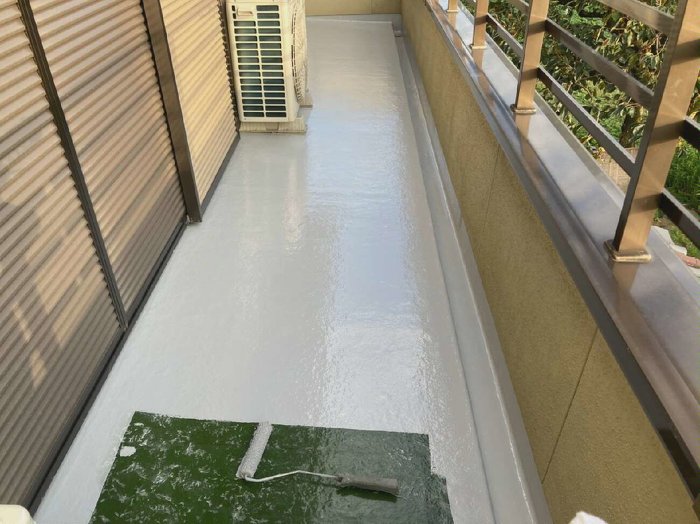 南面のベランダで、日当たりが良く直射日光が当たることと経年劣化が見受けられましたので、亀裂箇所の下地を直し、全体の防水をかけなおすことでしっかりと防水層を作らせていただきました。