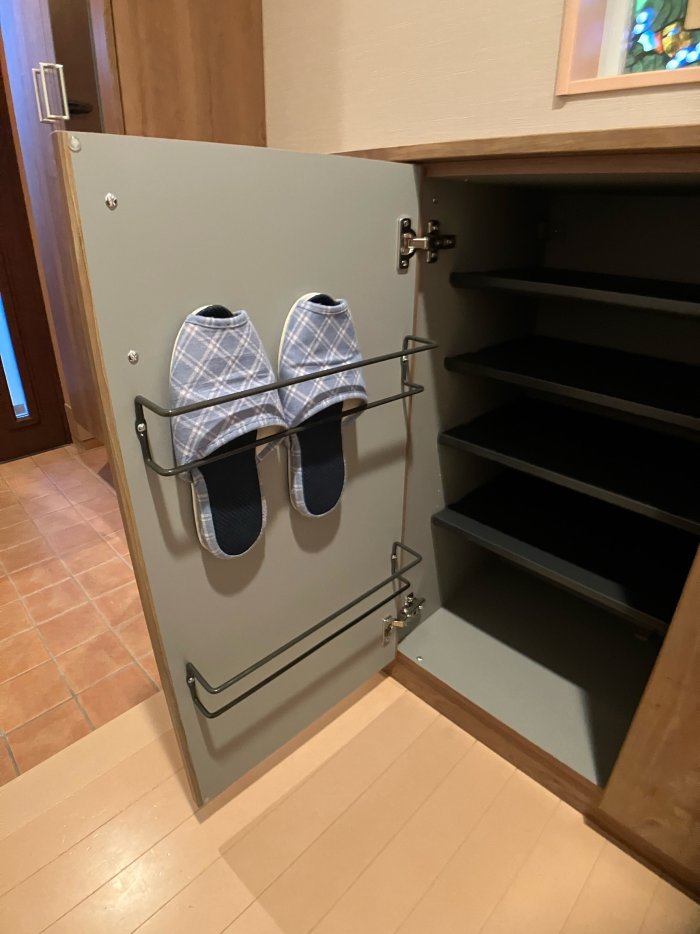 システム玄関収納では、幅や高さなど様々なパターンの組み合わせで取り付けることが可能です。姿見を取り付けたり、傘立てやスリッパ立てを取り付けることもできます。壁に固定するので下地工事が必要になります。今回は設置面のクロスの貼り替えをご一緒に行ったため、下地を入れて仕上げることができました。お気軽にご相談くださいませ!