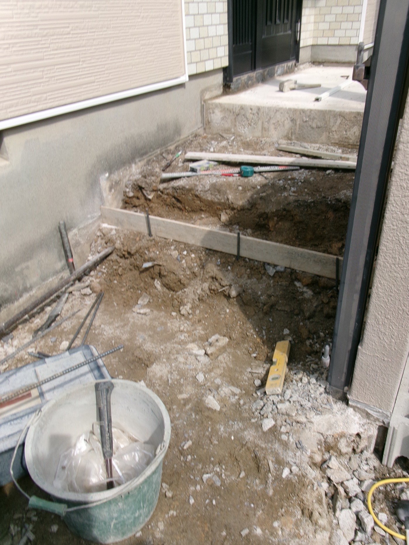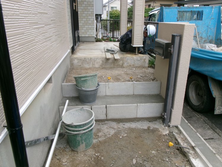 タイルが浮いたり割れたりすることがあるとお聞きして、外構の職人さんと現地にお伺いして、下地が下がっている可能性が高いため、部分的な補修より全体的な貼り替えをご提案させていただきました。下地の土間にはメッシュも入れて強度を増しています。以前よりもタイルの1枚あたりの大きさは300角と大きいタイプが主流となってきています。お気軽にご相談くださいませ。