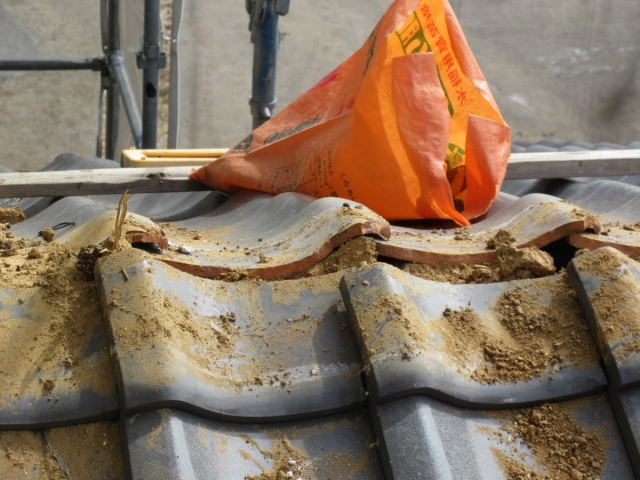 古い棟を取外し、中の屋根土も撤去したのちにガイドライン工法により冠瓦が躯体に連結されるので、巨大地震、台風などが来てもよほど崩れることはありません。