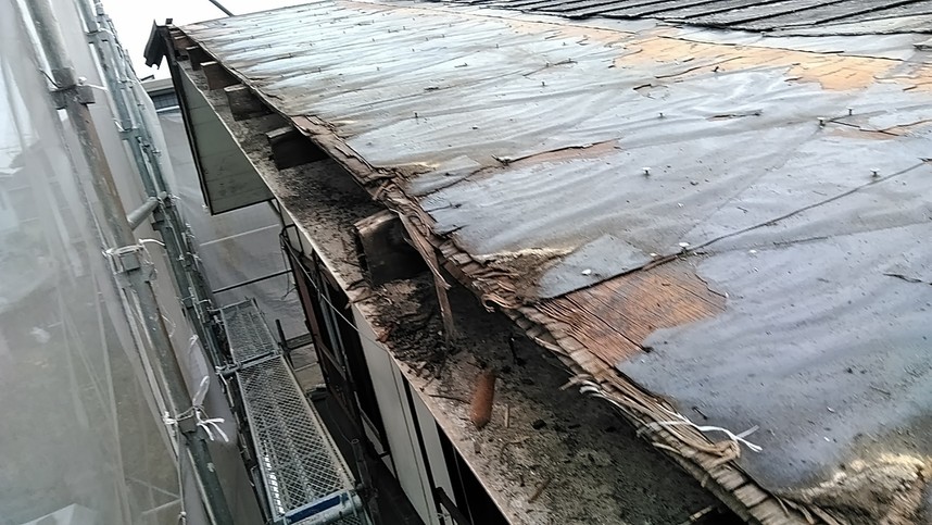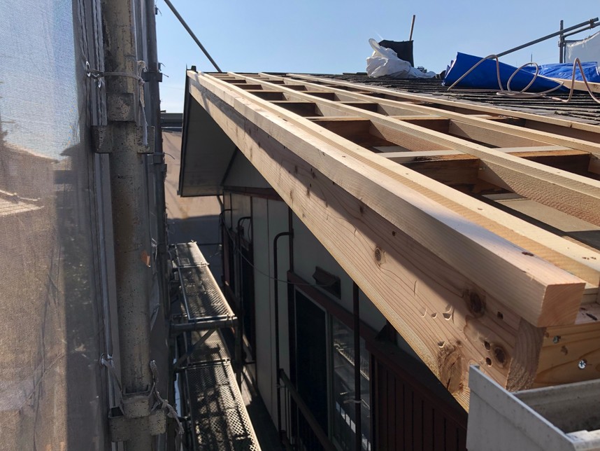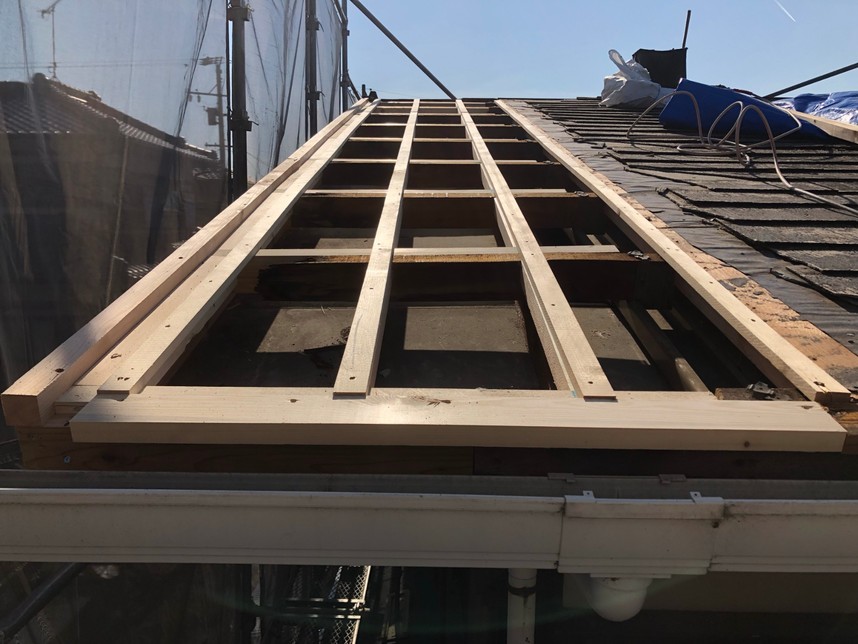 腐食していない部分の木を利用して屋根の下地を再建します。