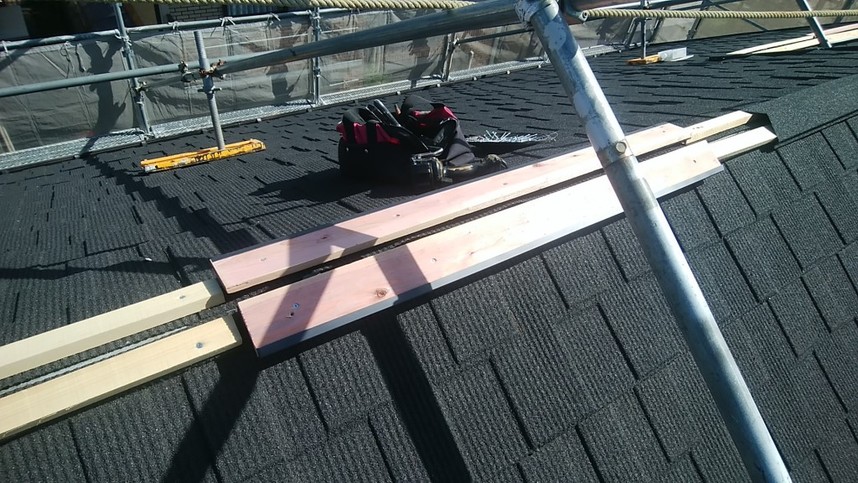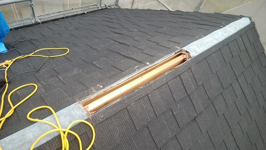 夏場に屋根裏にこもる熱気を外に逃がす換気棟の施工の様子。