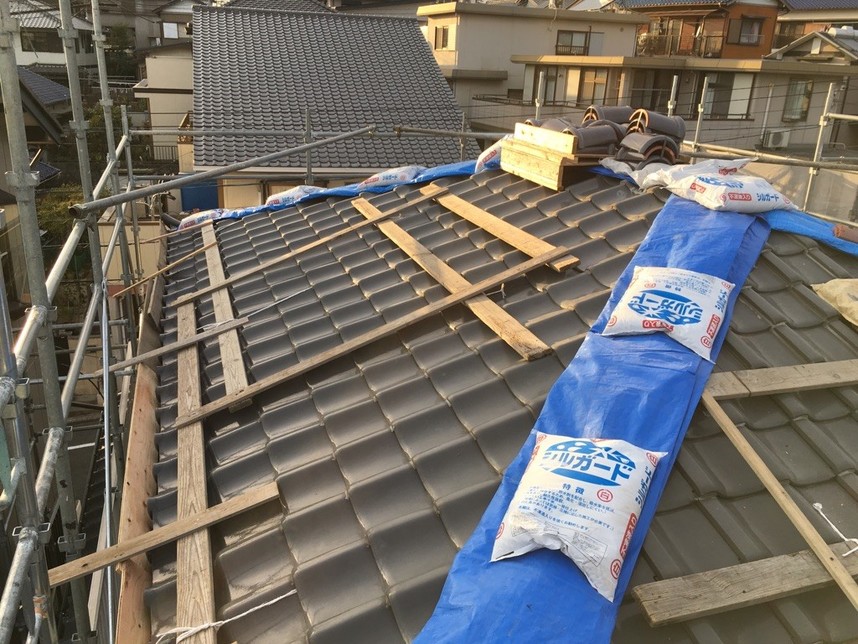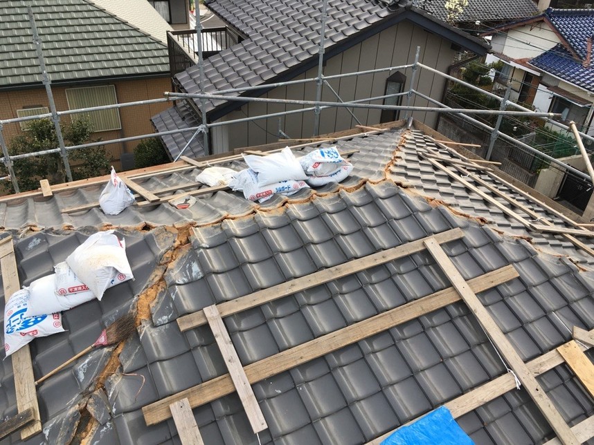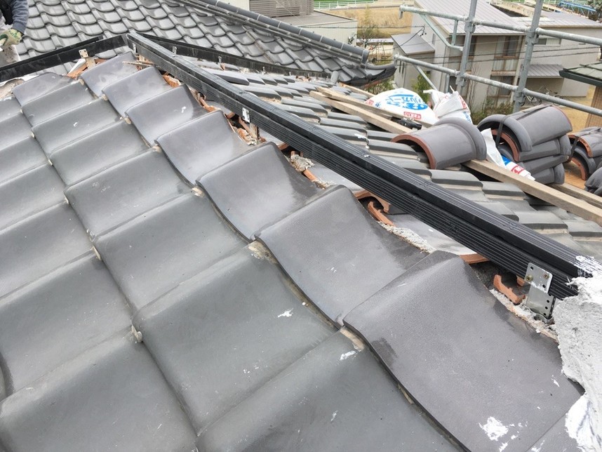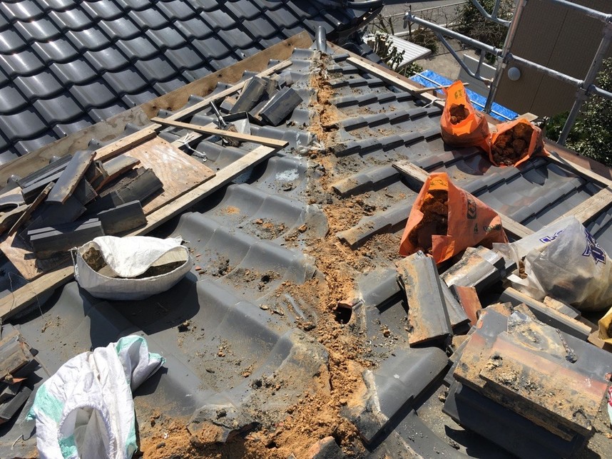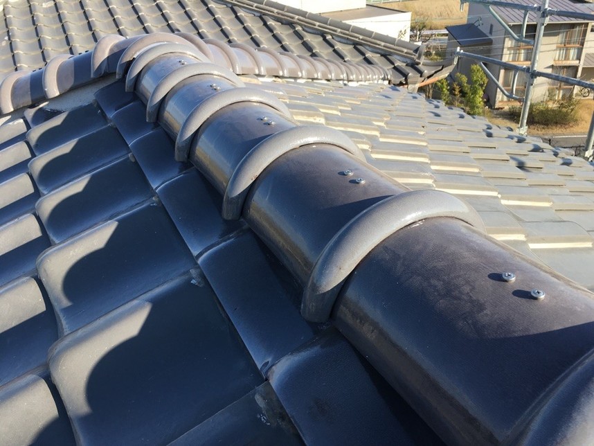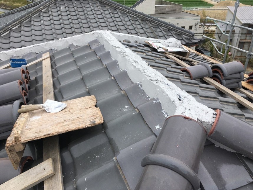 今回、雨漏れが原因で棟の改修工事を行いました。原因としては以前の屋根の工事で棟の漆喰を上塗りしたことで雨水が屋根の中に侵入したと考えられます。また、耐震にもしたいという希望もあり耐震工法による施工を行いました。