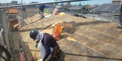 下地補強後、ビス留に強いアスファルトルーフィングをしようして、1次防水を行います。
