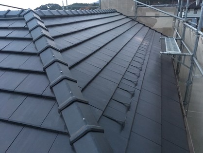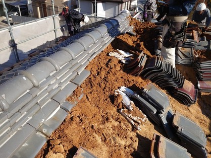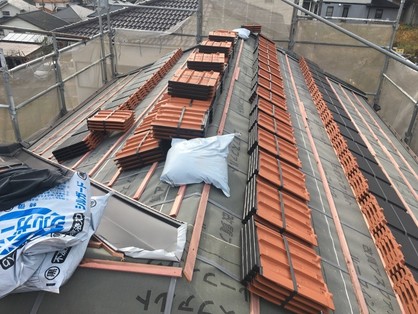今まで太陽熱温水器が乗っていたために屋根のメンテナンスが出来なく、温水器を降ろした際に屋根の土がボロボロと落ちてきたことがきっかけでご相談に来られたお客様です。調査した結果、屋根の土が傷んでおり防水機能が無い状態でした。金属の屋根にするか瓦の屋根にするか悩まれていましたが今回は住宅の雰囲気にもあう陶器瓦を選択されました。