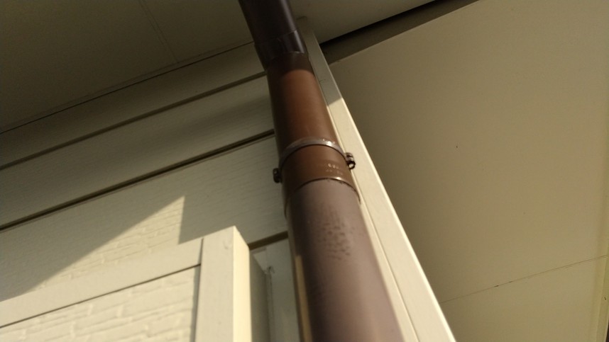 しかし今回は、変形がひどく補修をしても、再度別の場所からの破損が発生すると判断いたしましたので、最小範囲として、軒樋、集水器を交換して、竪樋に接続するという方法をとりました。竪樋が丸形でしたので、できた方法になります。