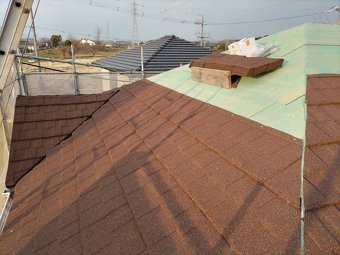 施工前の屋根はカラーベストで、カビコケの発生や割れなどが見受けられましたので塗装よりも今後のメンテナンスを考えた際に屋根カバーという選択肢もご提案させていただきました。