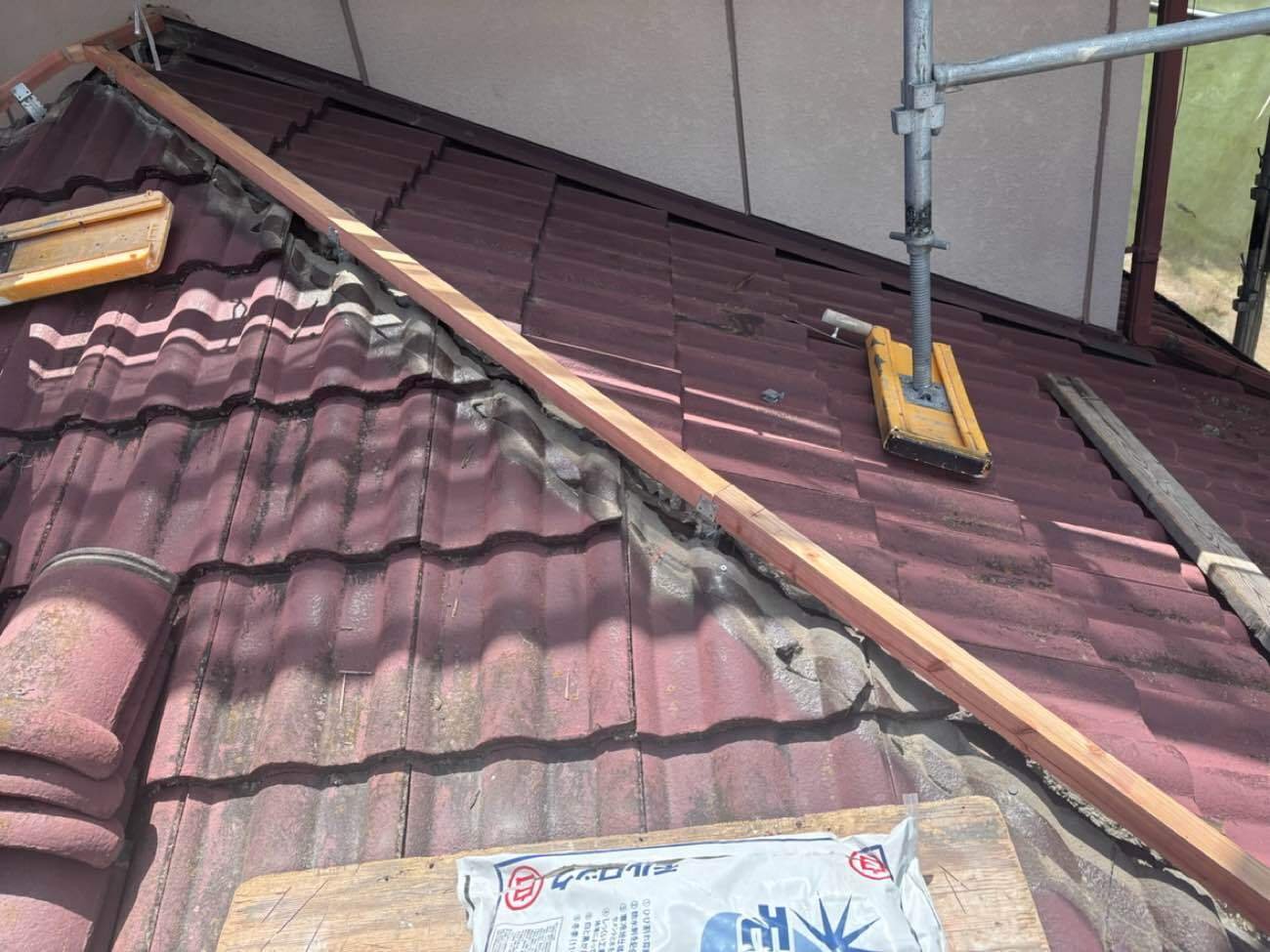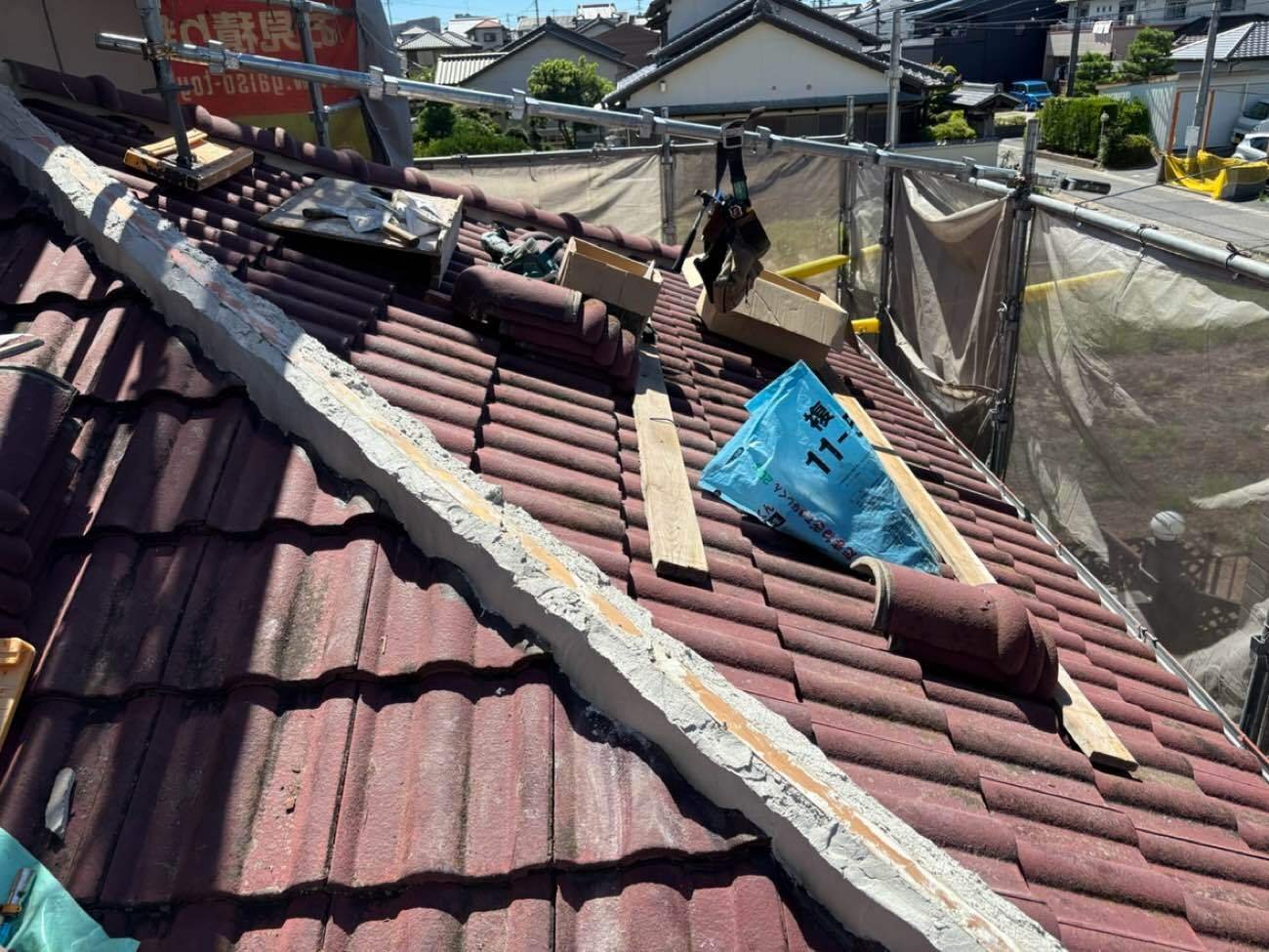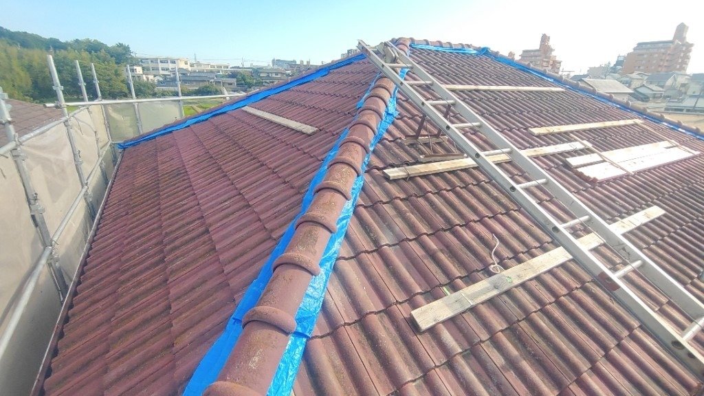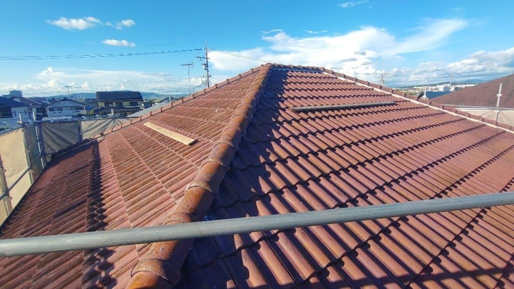 今回は棟(屋根の頂点部分)のやり直しで、割れ等も有りませんでしたのでそのまま再利用して施工しています。