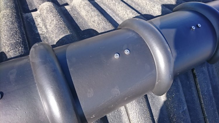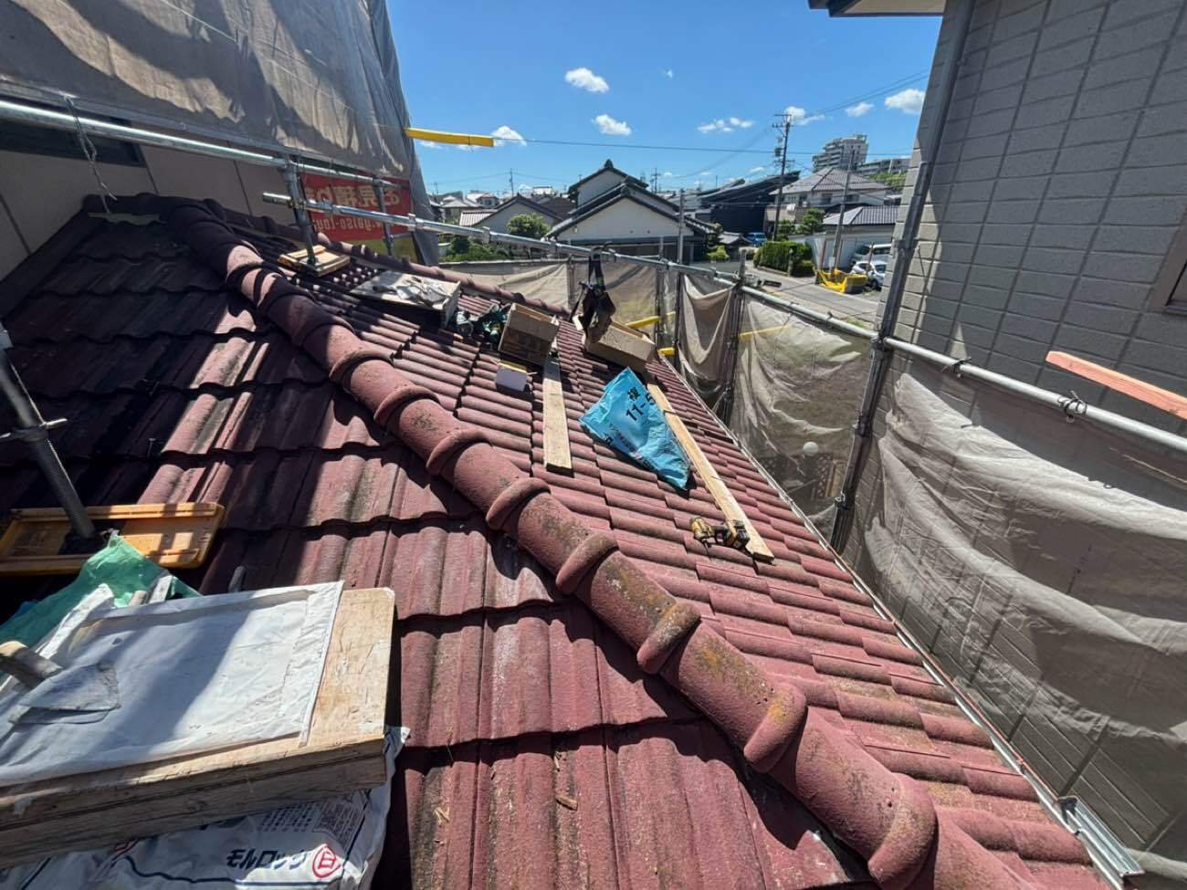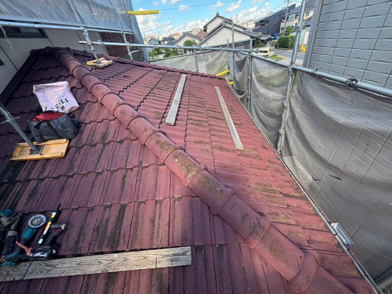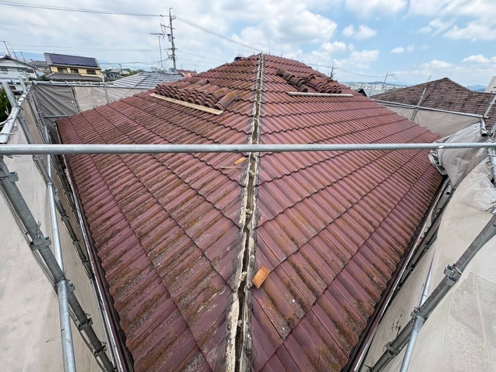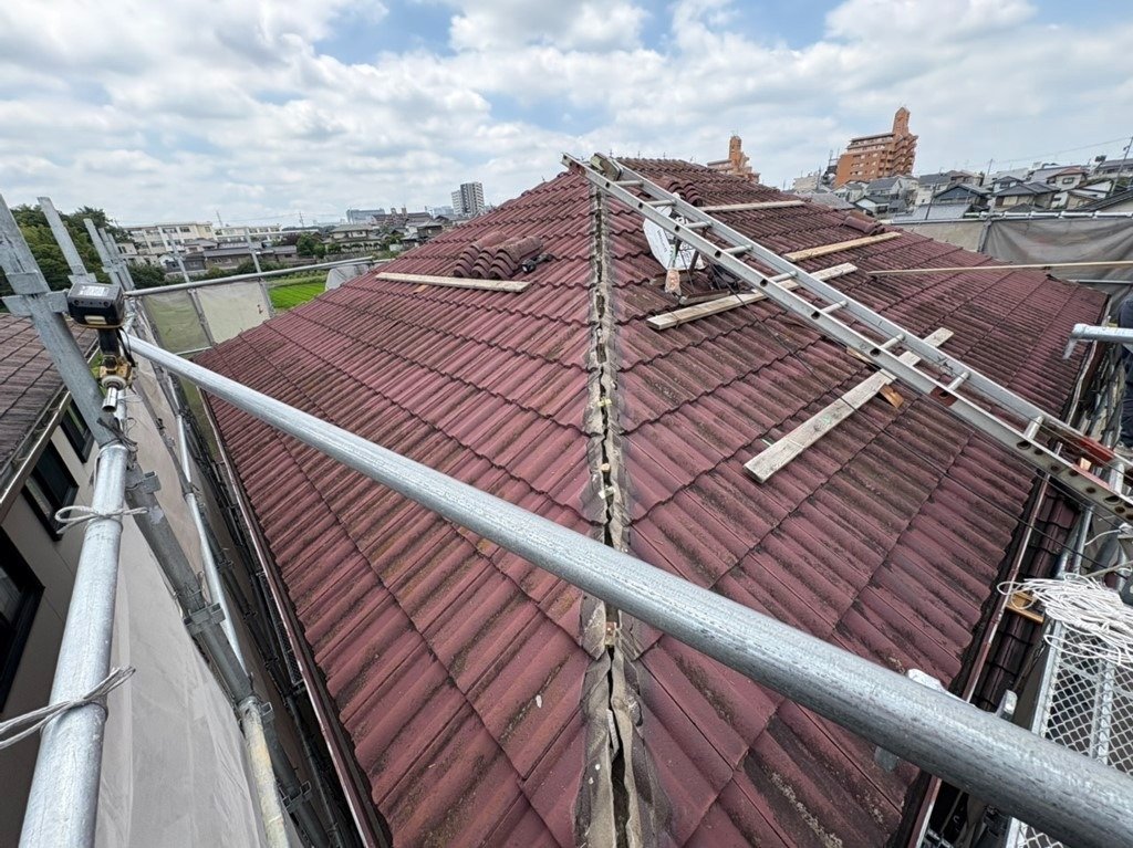 今回は棟(屋根の頂点部分)のやり直しで、割れ等も有りませんでしたのでそのまま再利用して施工しています。