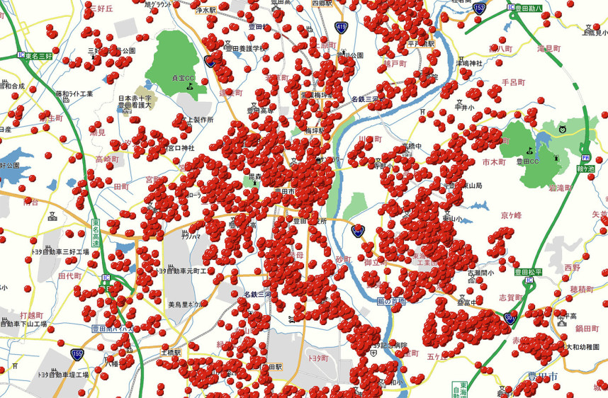こちらの図は、当社の施工実績を赤色で記した「リフォーム実績マップ」です。