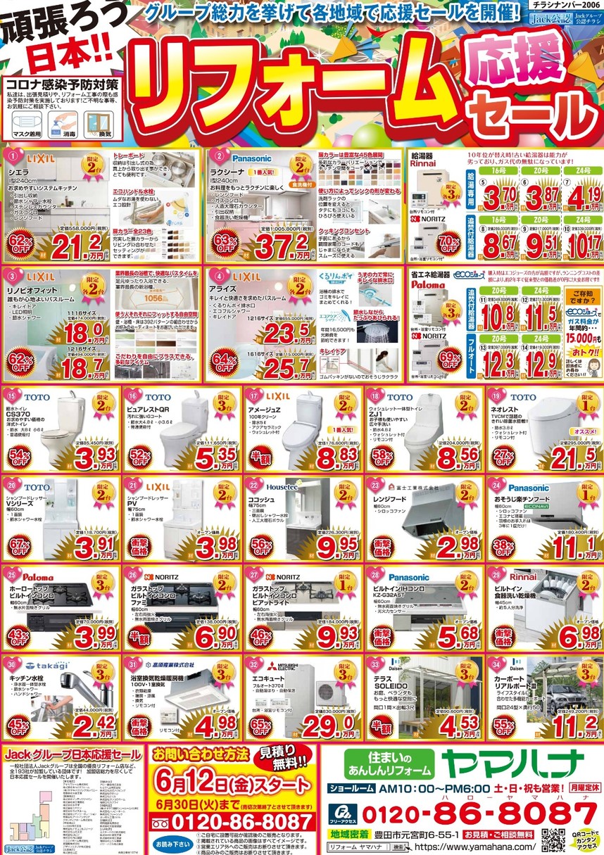 2020年06月12日(金) 頑張ろう日本!リフォーム応援セール!(6月30日まで) 頑張ろう日本!!リフォーム応援セール!! (6月30日まで) 期間限定のリフォーム応援セールを開催中です! 台数限定の商品はどうぞお早めに! ※売り切り次第終了となります。