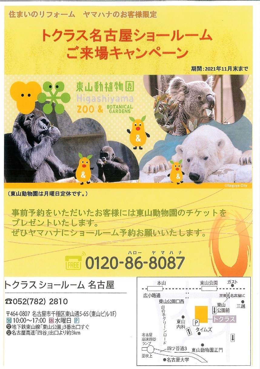 2021年07月30日(金) 【ヤマハナ限定】トクラス名古屋SRご来場キャンペーン! 【ヤマハナ限定】 トクラス名古屋ショールーム ご来場キャンペーン ヤマハナよりトクラス名古屋ショールームに 事前予約にてご来場いただいたお客様に、 東山動植物園のチケットをプレゼント致します!! 是非この機会にトクラス名古屋ショールームへご来場ください♪ ※期間 2021年11月末まで