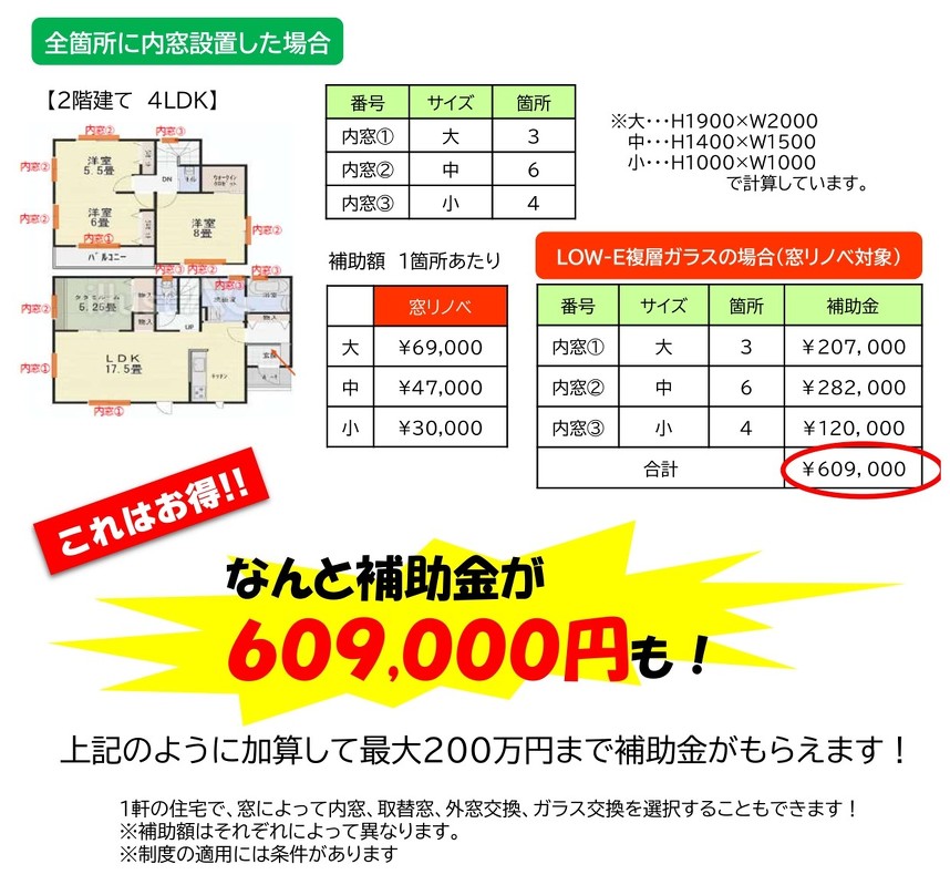 例えば内窓1窓で69,000円(窓面積2.8m2以上の場合)という